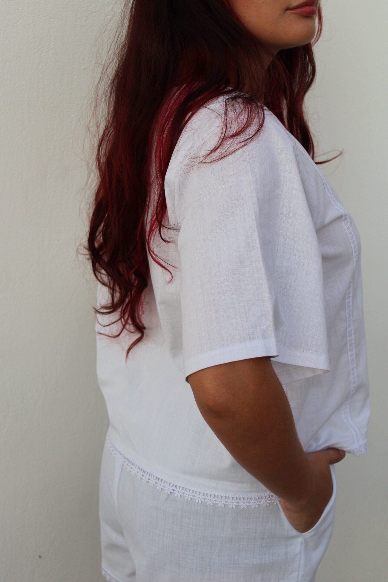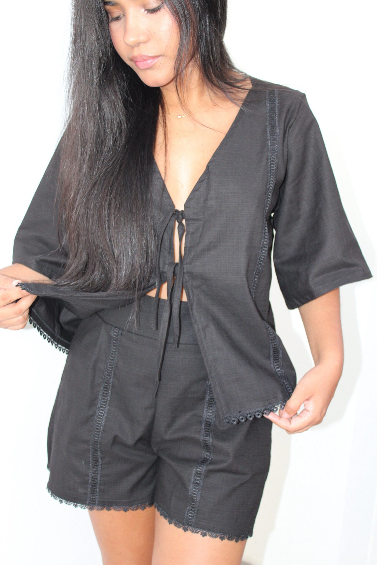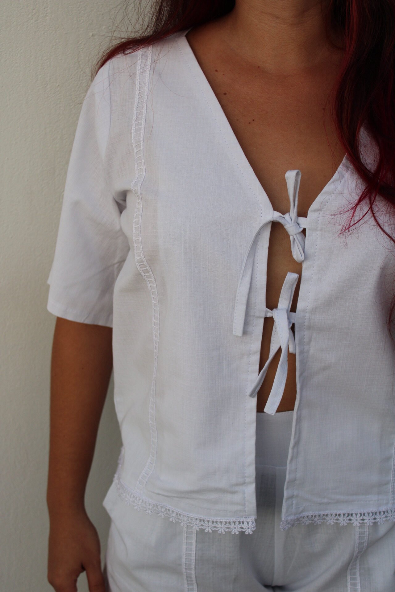 Blusa de lino blanco con detalles en guipure y lazos para amarrar en el pecho.