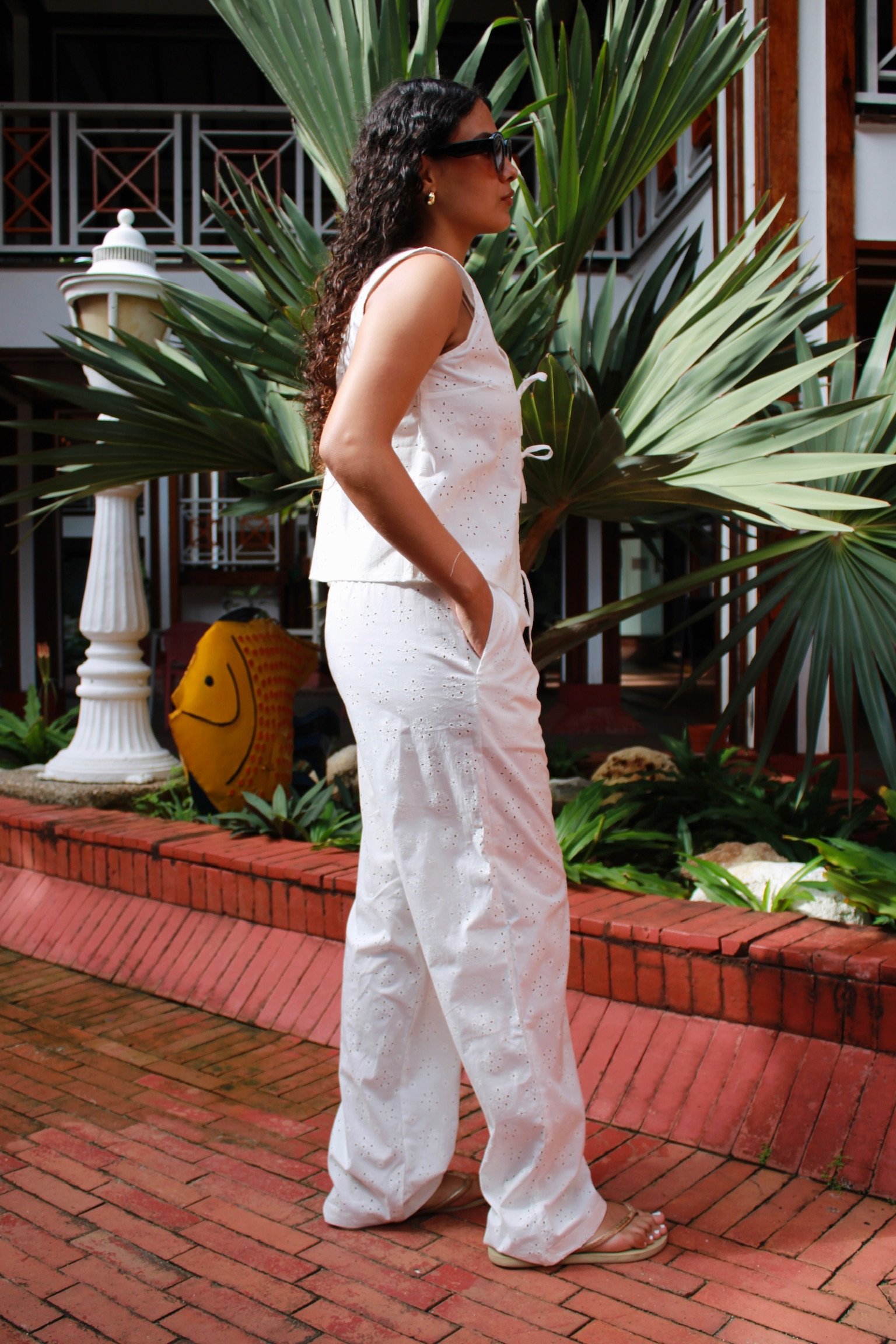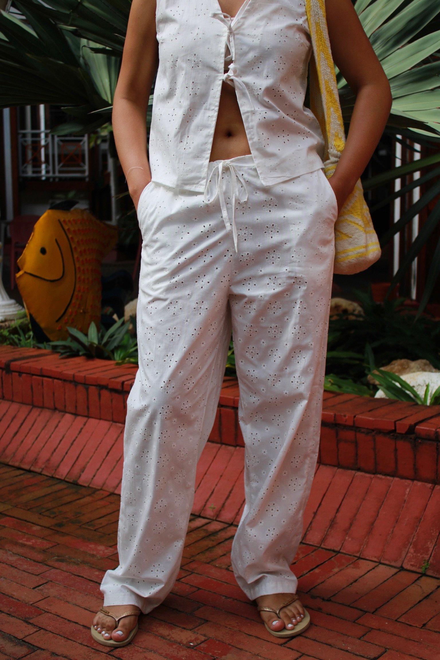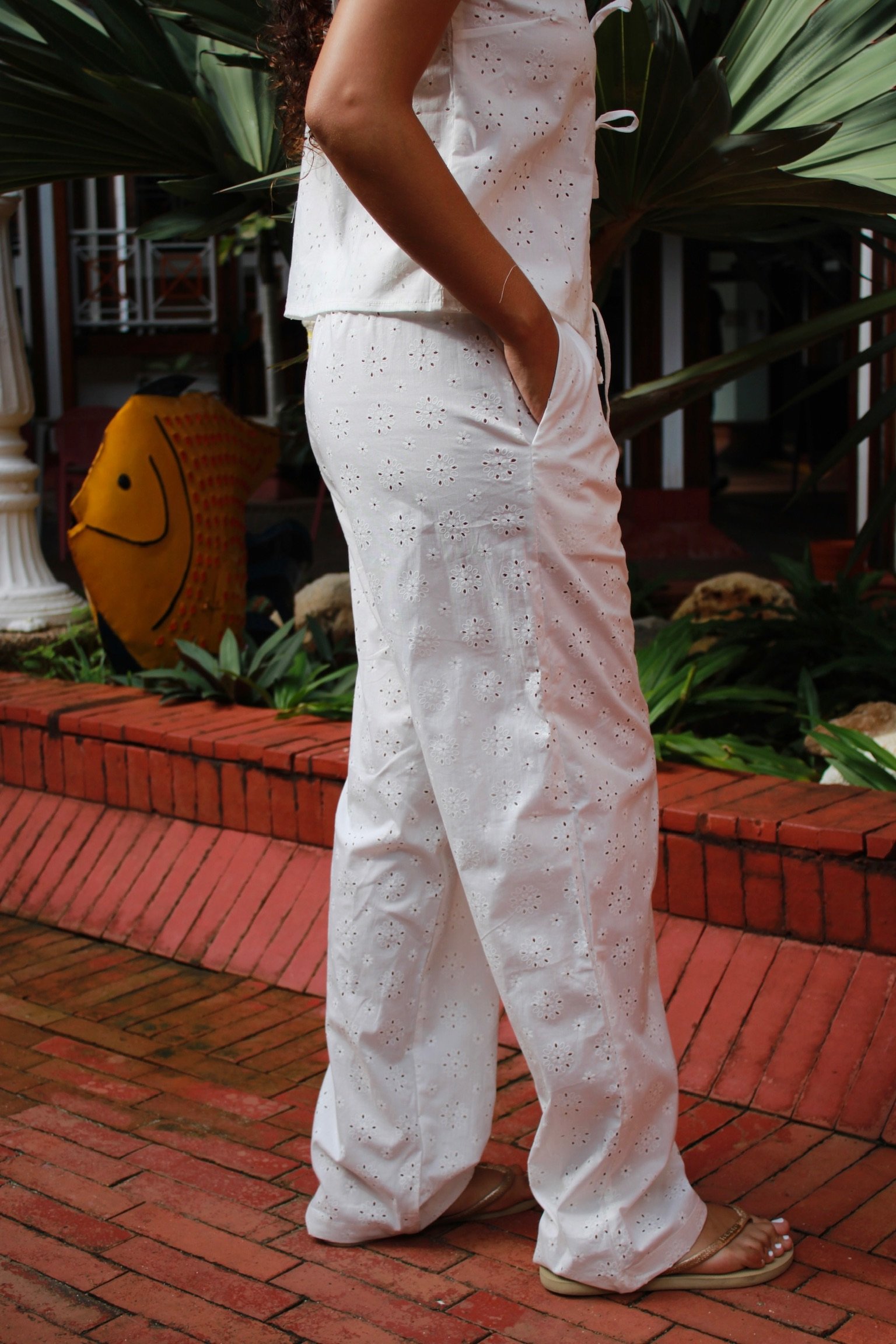 Descubre el Pantalón Margarita: confeccionado en ojalillo, de talle a la cadera y bolsillos laterales. Su silueta baggy aporta comodidad y estilo, además es totalmente ajustable para adaptarse a tu figura. Ideal para combinarlo en tus looks de verano.
