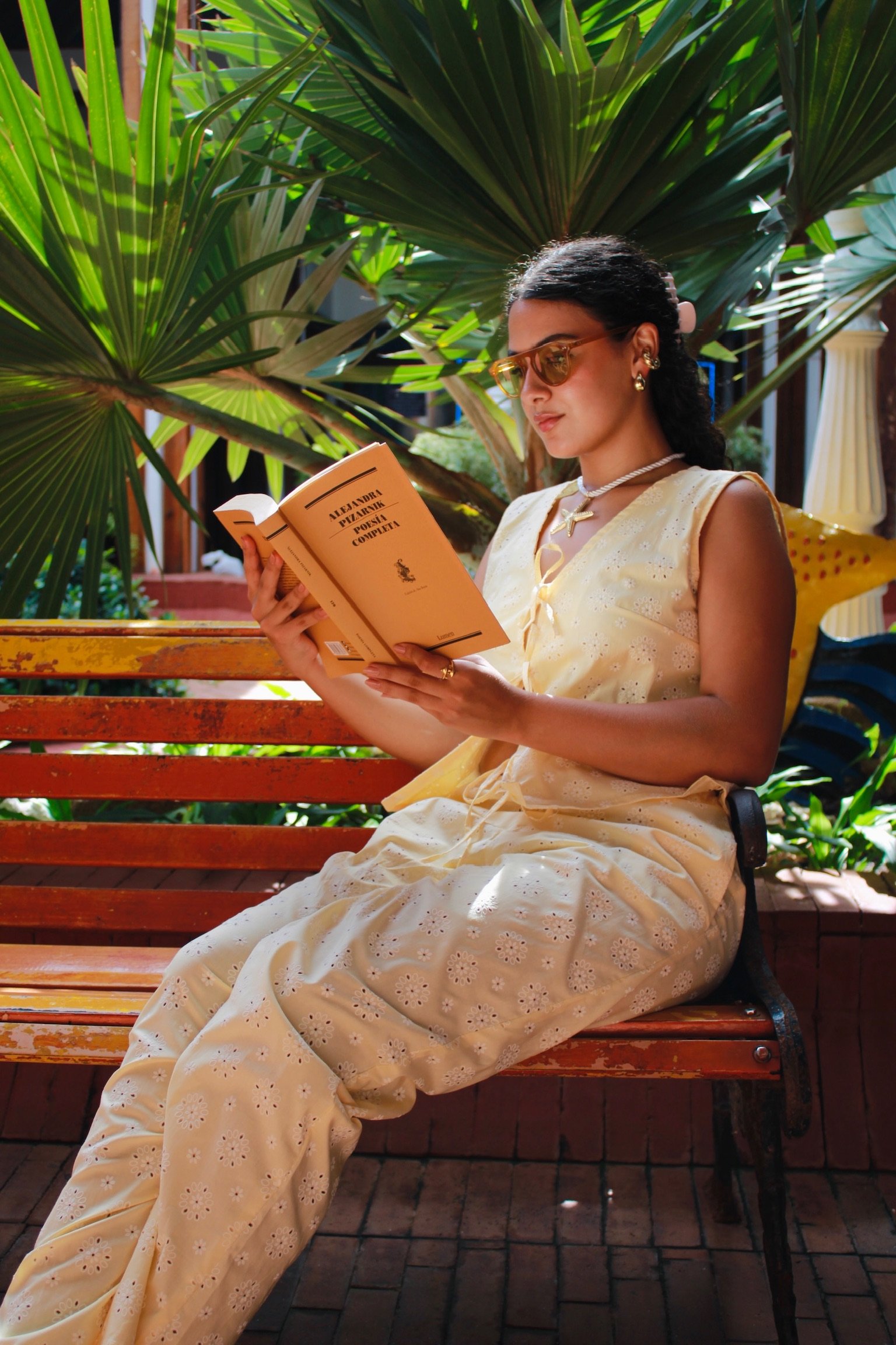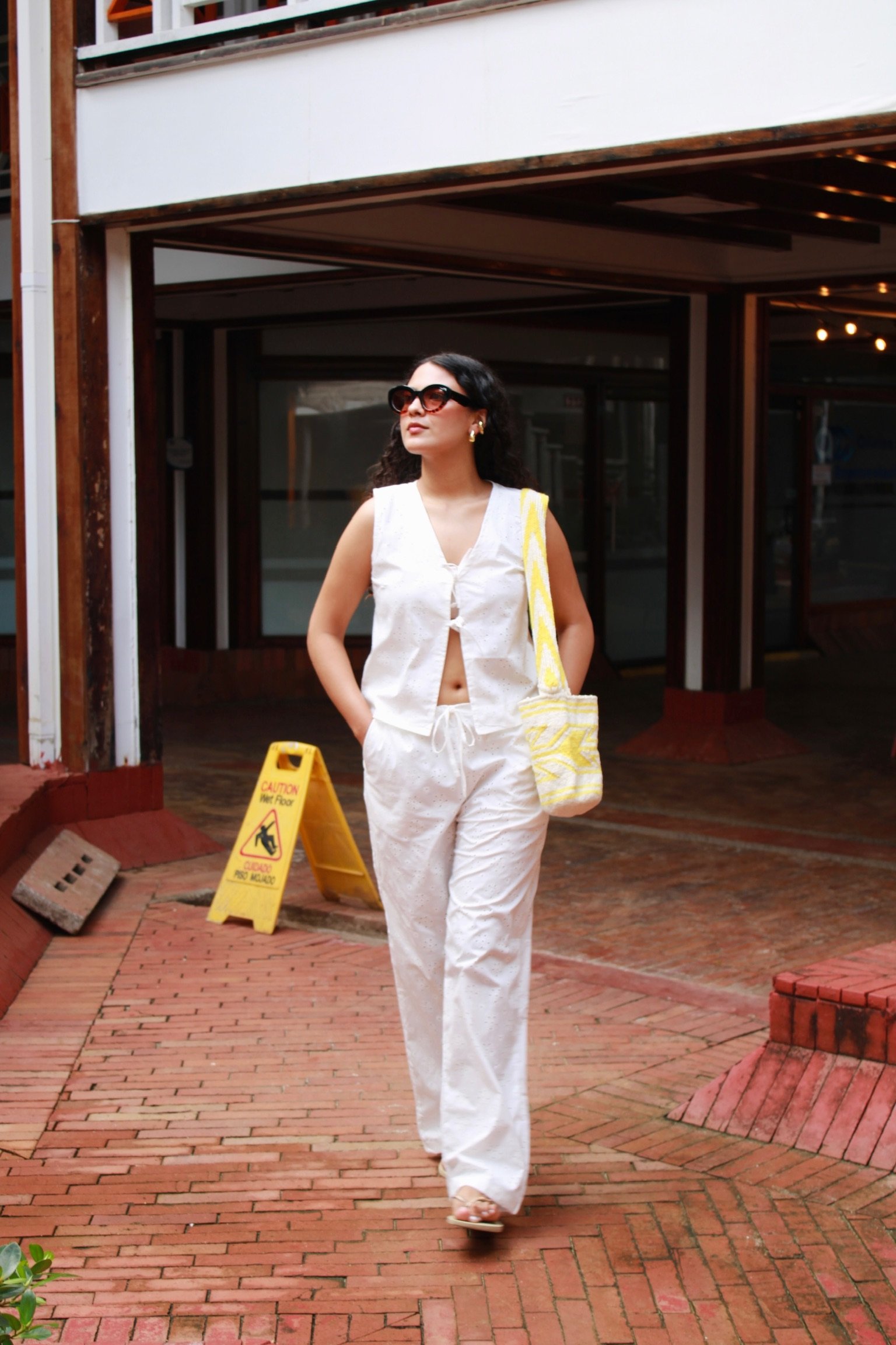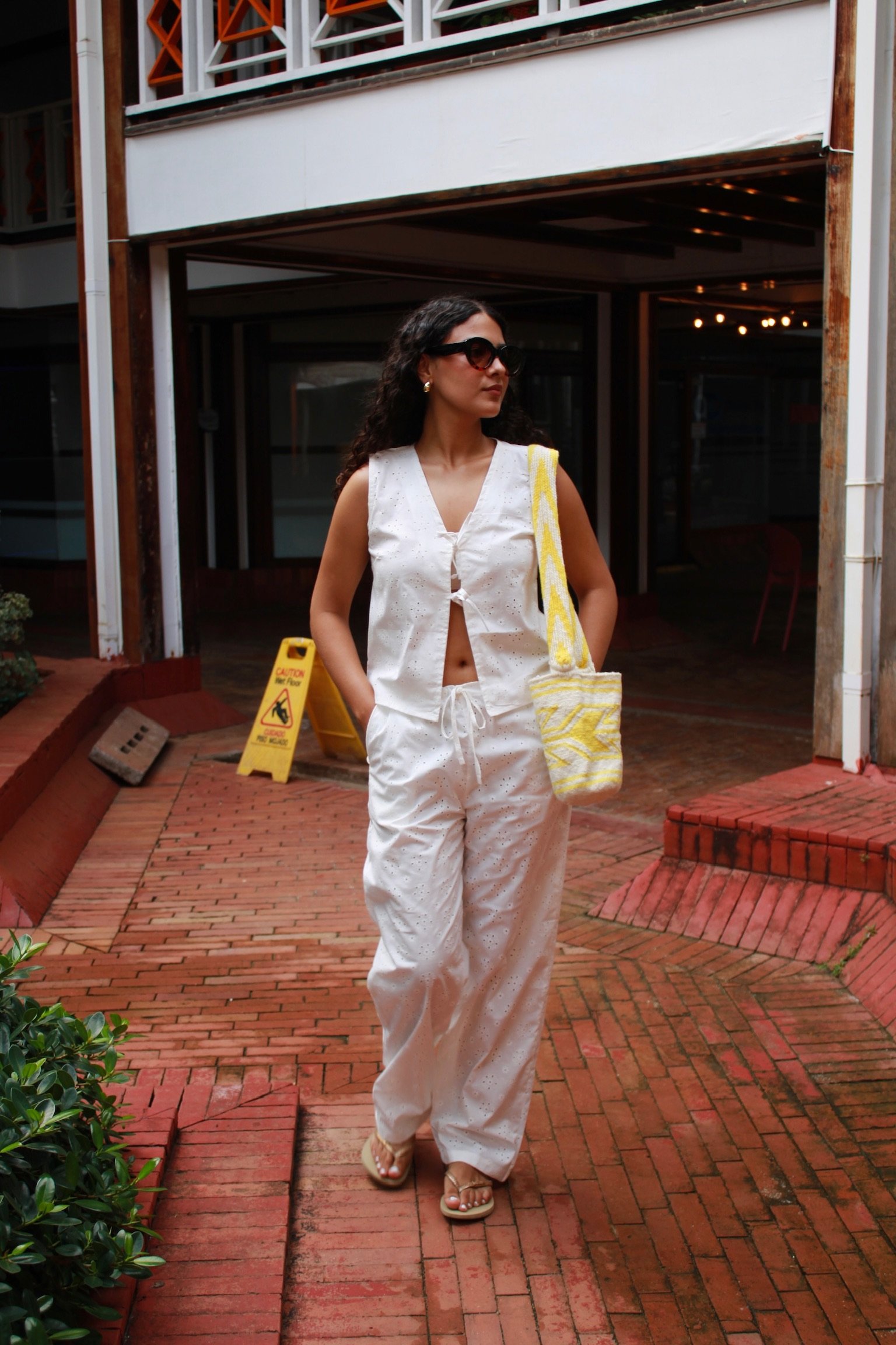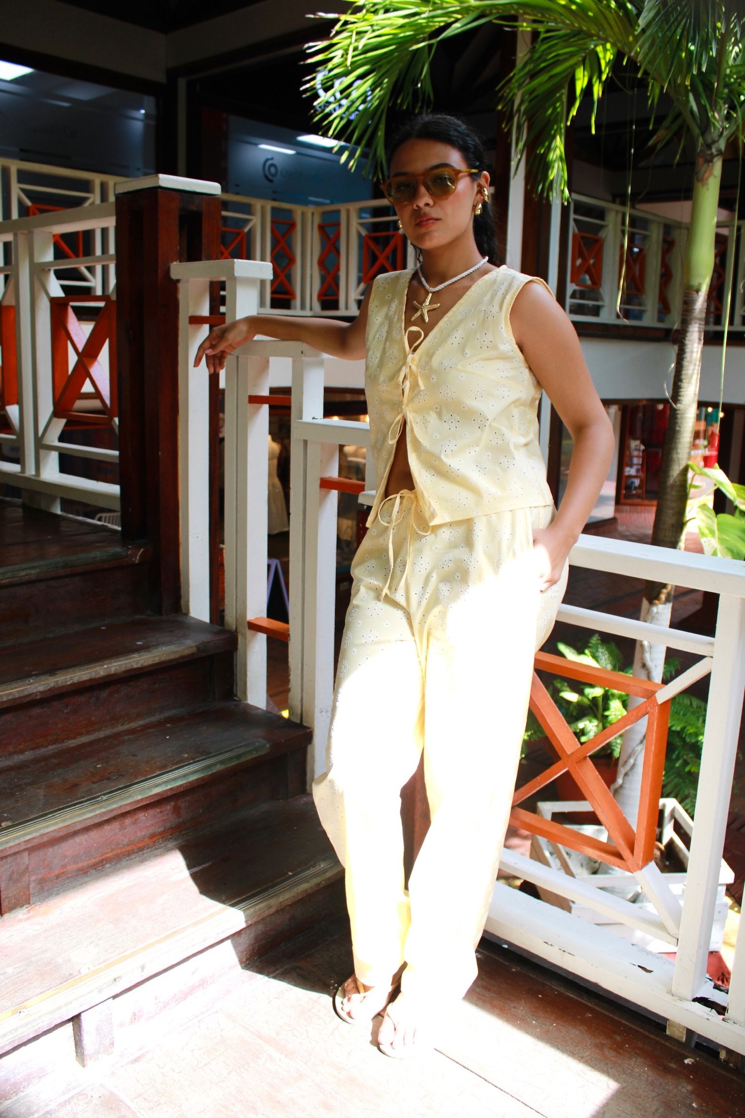 Descubre el Pantalón Margarita: confeccionado en ojalillo, de talle a la cadera y bolsillos laterales. Su silueta baggy aporta comodidad y estilo, además es totalmente ajustable para adaptarse a tu figura. Ideal para combinarlo en tus looks de verano.
