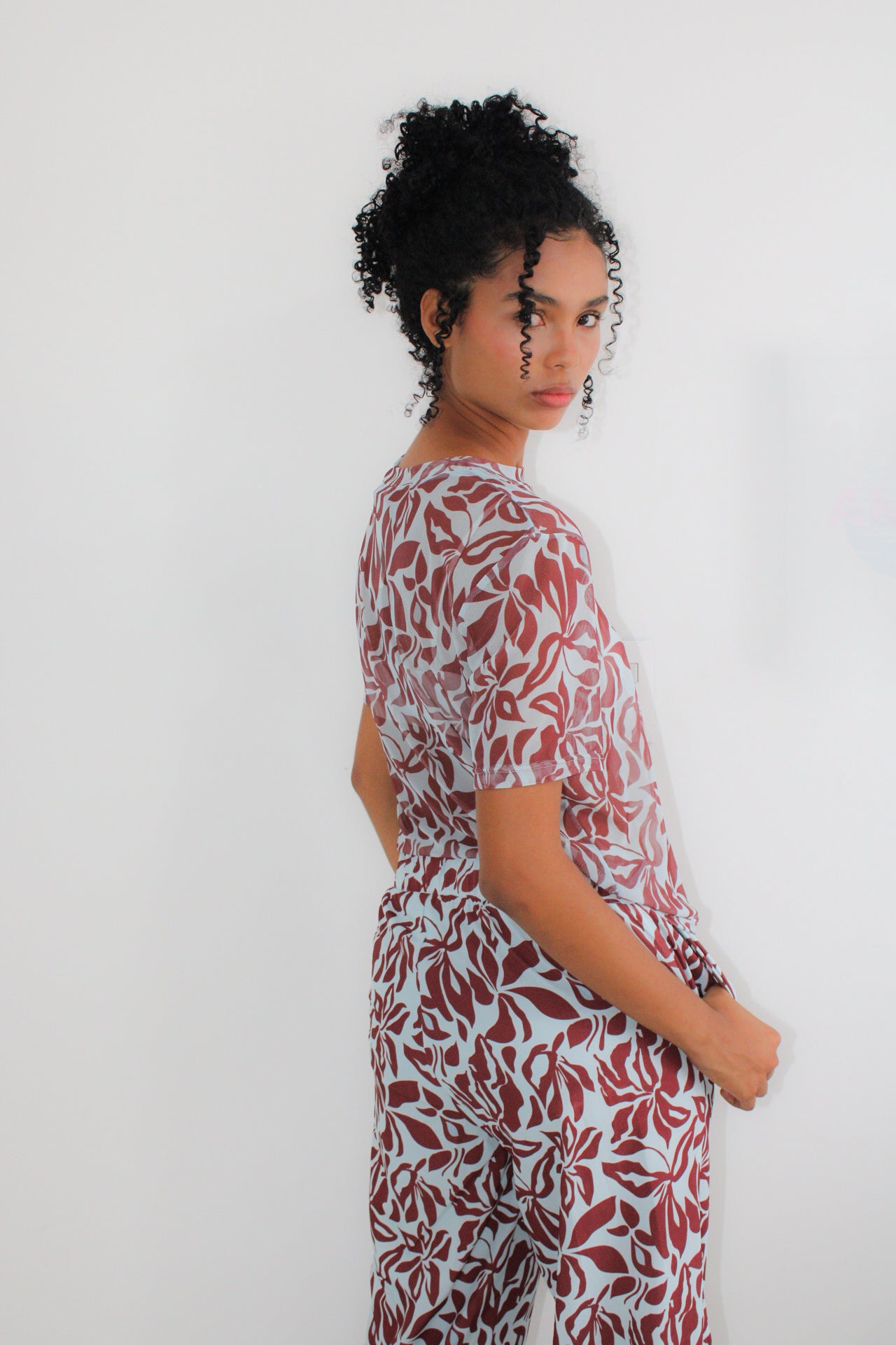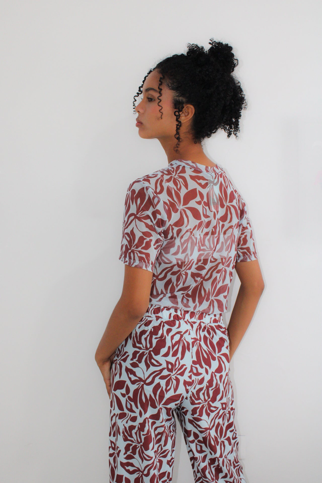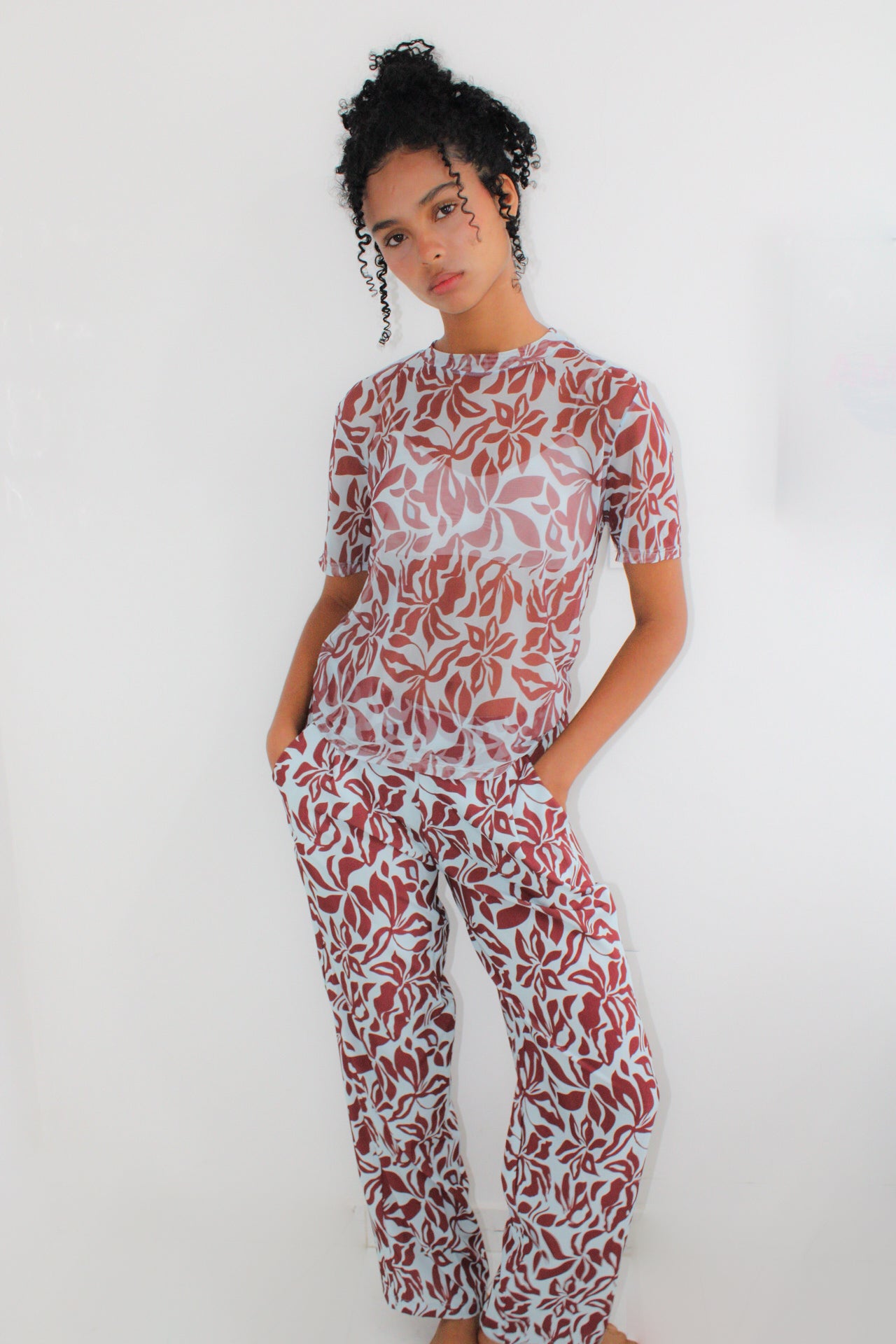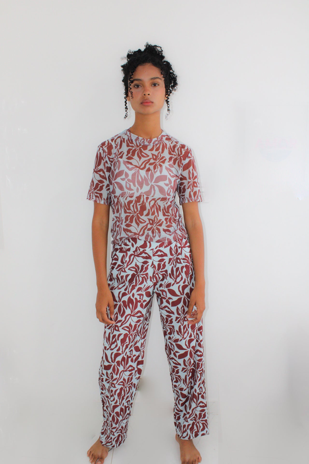 Blusa de malla estampada y un pantalón cómodo, ambos con elástico en la pretina y bolsillos laterales.