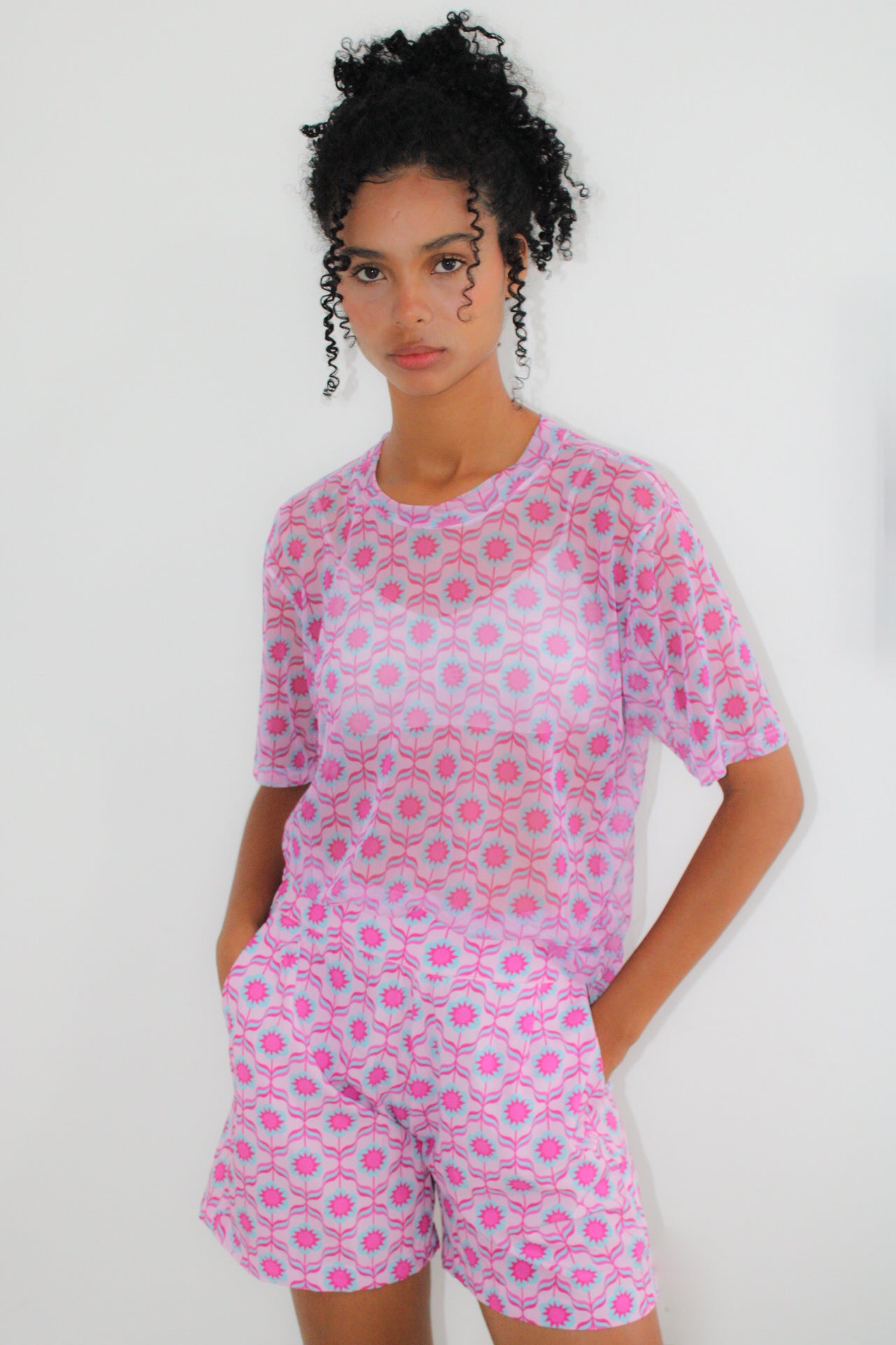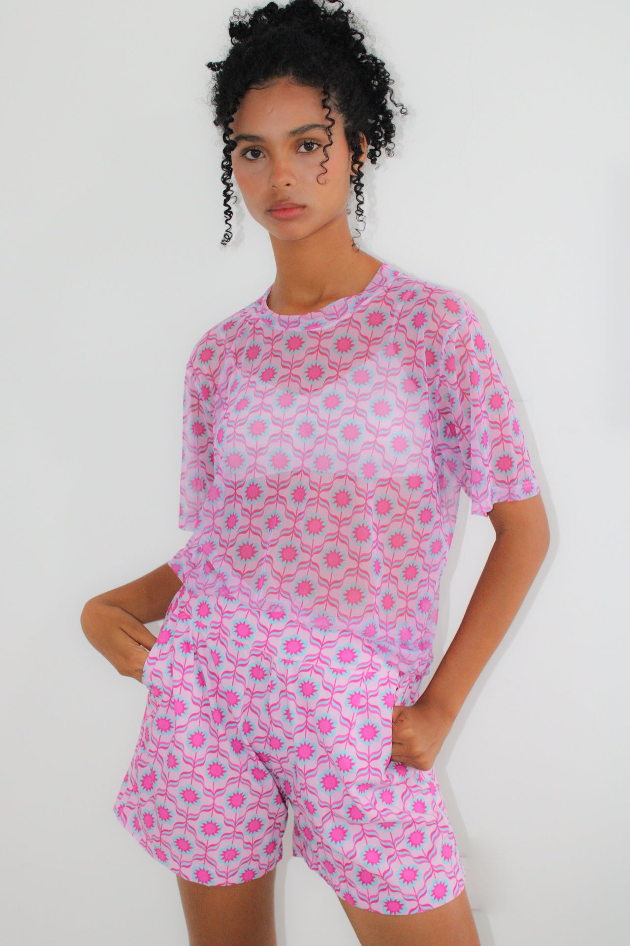 Blusa de malla estampada y un short cómodo, ambos con elástico en la pretina y bolsillos laterales.